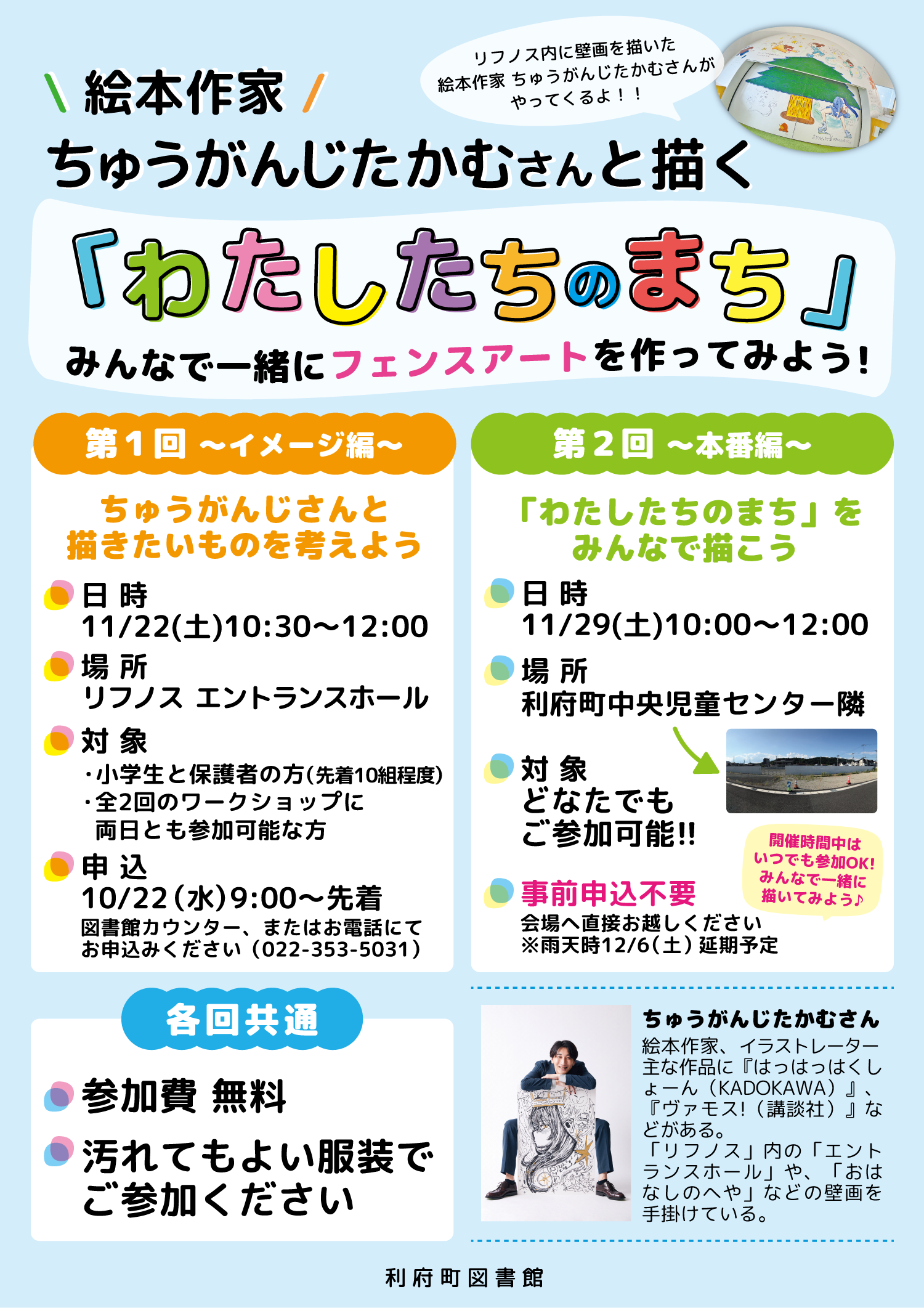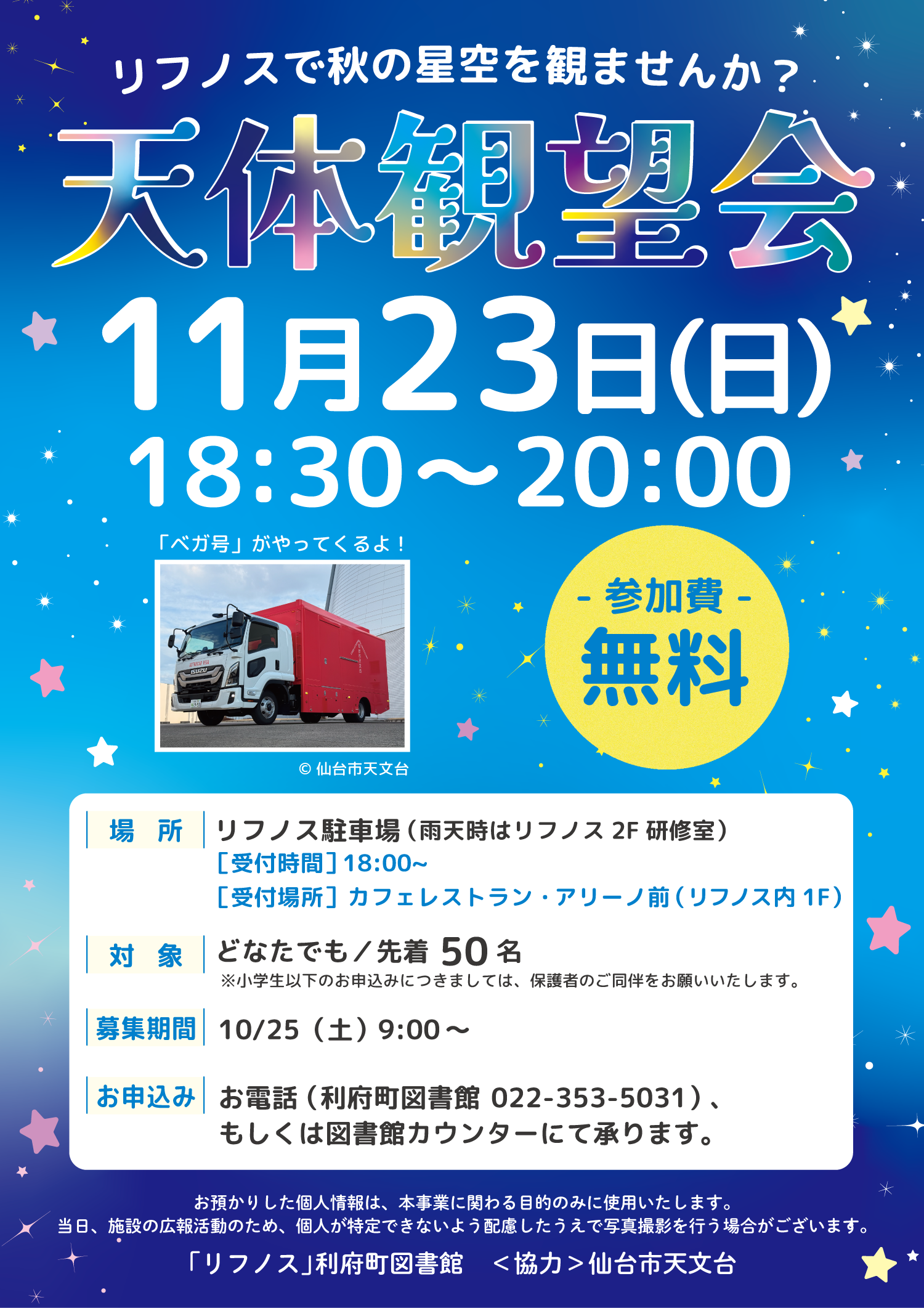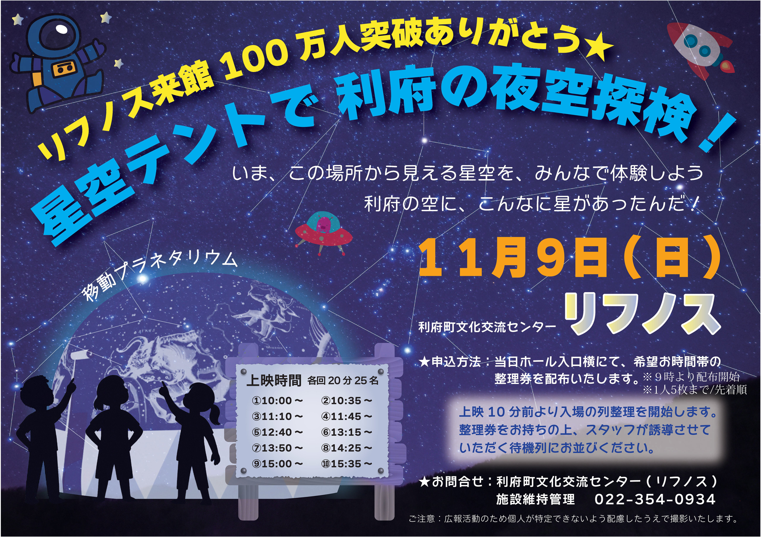 2025.10.27 施設維持管理 11/9(日)開催 星空テントで利府の夜空探検!【当日9:00~整理券配布(1人5枚まで)】 2025.10.21 図書館 11/22(土)・11/29(土)開催『絵本作家・イラストレーター ちゅうがんじたかむさんと描く「わたしたちのまち」』【申込開始:10/22(水)】 2025.10.20 図書館 11/23(日)開催 天体観望会【キャンセル待ち受付中】 2025.10.15 公民館 11/27(木)開催 利府町の食材で世界料理教室【町内優先申込期間:10月28日(火)~11月11日(火)】 2025.10.10 図書館 11/11(火)開催 3時の読書会【申込開始:10/11(土)】 2025.10.06 文化会館 エントランス無料コンサート【11月30日(日)】 2025.10.01 図書館 【図書館】10月のイベントカレンダー 2025.10.01 文化会館 【12月20日(土)開催】手影絵パフォーマンス「Hand Shadow Show」 2025.09.30 カフェ公民館図書館文化会館 来館者100万人突破予想クイズを開催します!!(応募期間:10/1~10/11) 2025.10.01 公民館文化会館 令和7年度 利府町文化祭について【開催:11月2日(日)・3日(月)】 123>>>