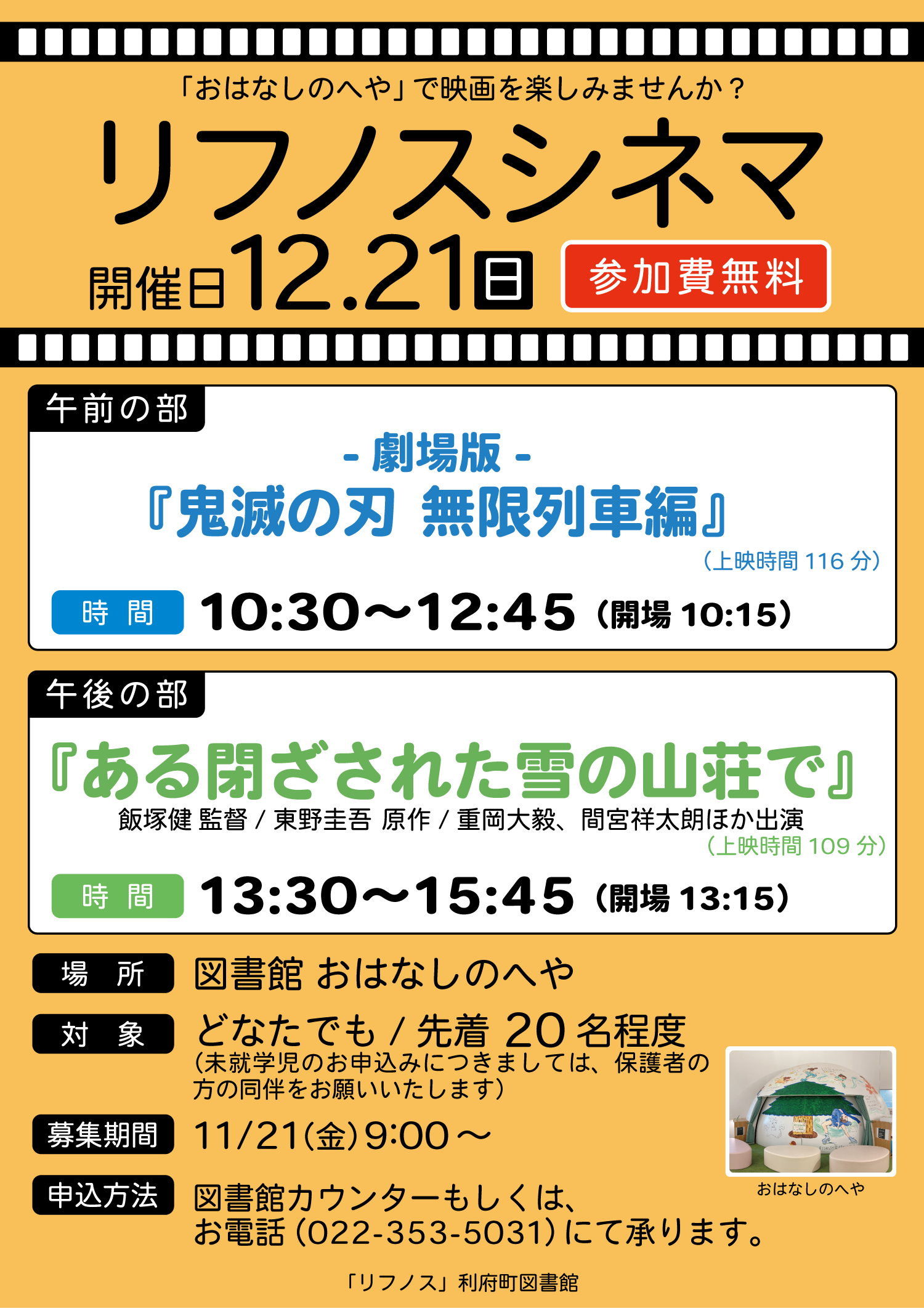 2025.11.21 図書館 12/21(日)開催 リフノスシネマ【申込開始:11/21(金)】 2025.11.14 公民館 【12月26日(金)開催】長期休暇こども宿題お助け&体験教室(冬)「書初め」【申込期間:11月28日(金)~12月11日(木)】 2025.11.12 図書館 12/13(土)開催 大人のための朗読会【募集期間:11/13(木)~11/30(日)】 2025.11.11 図書館 12/12(金)開催 3時の読書会【申込開始:11/12(水)】 2025.11.08 カフェ公民館図書館文化会館 【100万人記念イベント】パネル展、メッセージボード開催中! 2025.10.27 施設維持管理 11/9(日)開催 星空テントで利府の夜空探検!【当日9:00~整理券配布(1人5枚まで)】 2025.11.06 公民館図書館文化会館 【12月6日(土)開催】シンボルツリーの灯 2025.11.05 公民館 1/21(水)開催 今日から始める健腸生活~腸は健康の源~【申込期間:11月21日(金)~12月27日(土)】 2025.10.16 公民館 11/16(日)開催 おやこでリフレッシュフラ教室【町内優先申込期間:10月16日(木)~10月30日(木)】 2025.11.01 図書館 【図書館】11月のイベントカレンダー 123>>>