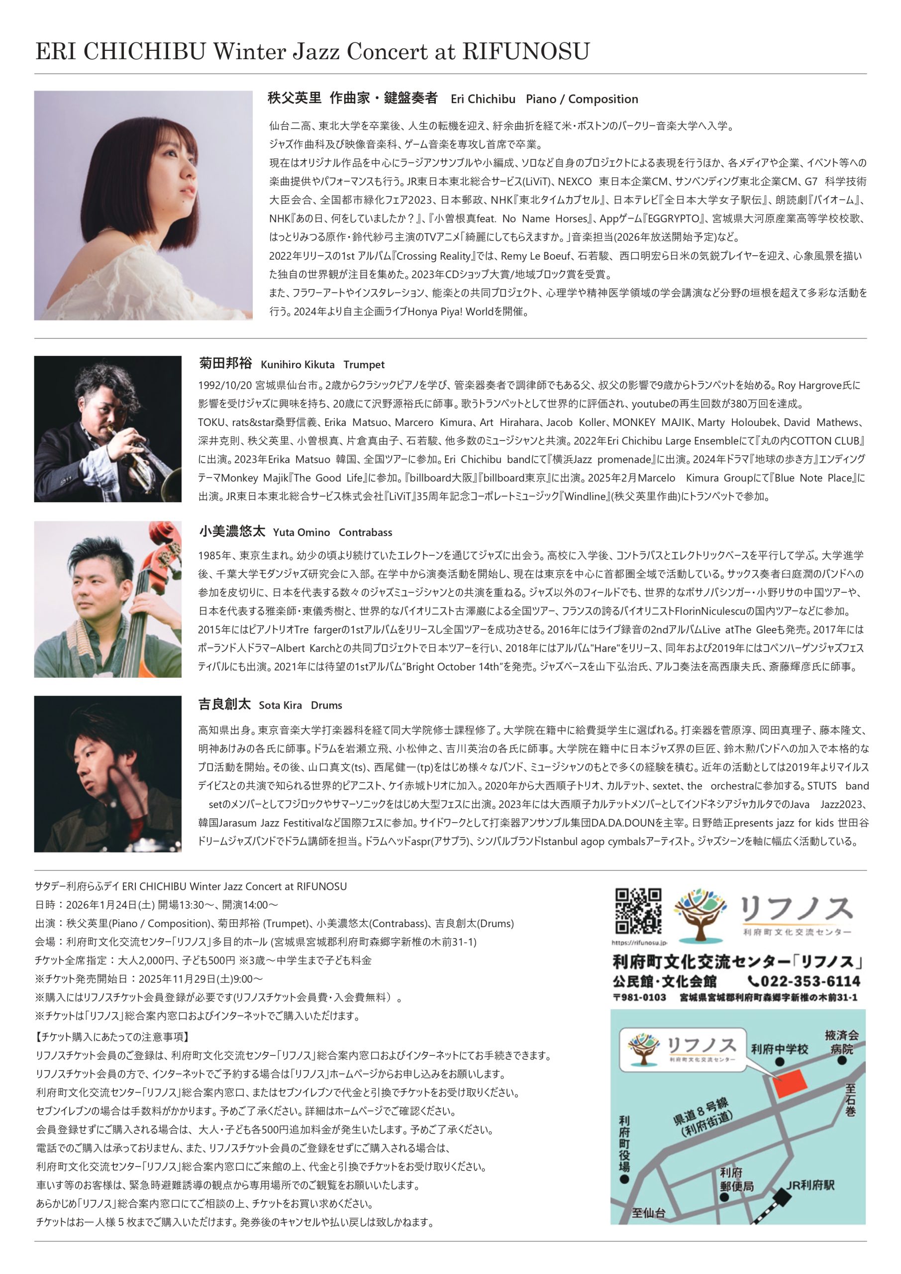 宮城県出身の音楽家・秩父英里とバンドメンバーによる、ジャズコンサートを開催します!