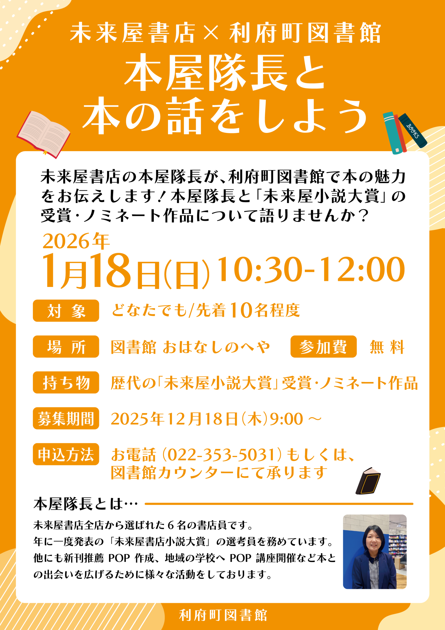 未来屋書店×利府町図書館 本屋隊長と本の話をしよう【申込開始:12/18(火)】