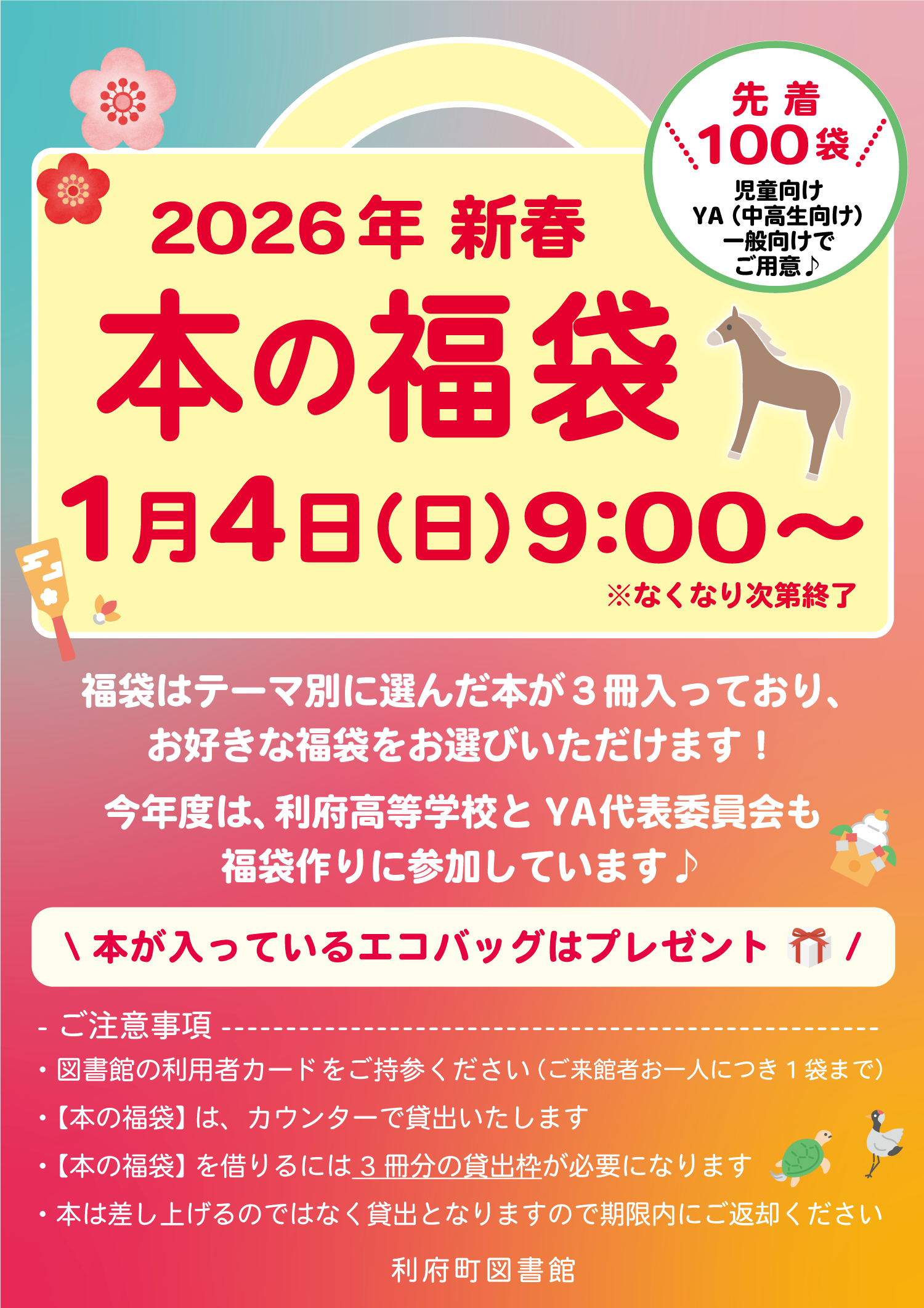 2025.12.18 図書館 2026/1/18(日)開催 児童文学作家 富安陽子 講演会 「本は不思議への扉」 2025.12.17 図書館 未来屋書店×利府町図書館 本屋隊長と本の話をしよう【申込開始:12/18(火)】 2025.12.15 図書館 2026年1月4(日)より「本の福袋」を貸出いたします! 2025.12.02 図書館 【図書館】12月のイベントカレンダー 2025.11.21 図書館 【受付終了】12/21(日)開催 リフノスシネマ 2025.11.12 図書館 12/13(土)開催 大人のための朗読会【募集期間:11/13(木)~11/30(日)】 2025.11.11 図書館 12/12(金)開催 3時の読書会【申込開始:11/12(水)】 2025.11.08 カフェ公民館図書館文化会館 【100万人記念イベント】パネル展、メッセージボード開催中! 2025.11.06 公民館図書館文化会館 【12月6日(土)開催】シンボルツリーの灯 2025.11.01 図書館 【図書館】11月のイベントカレンダー 123>>>