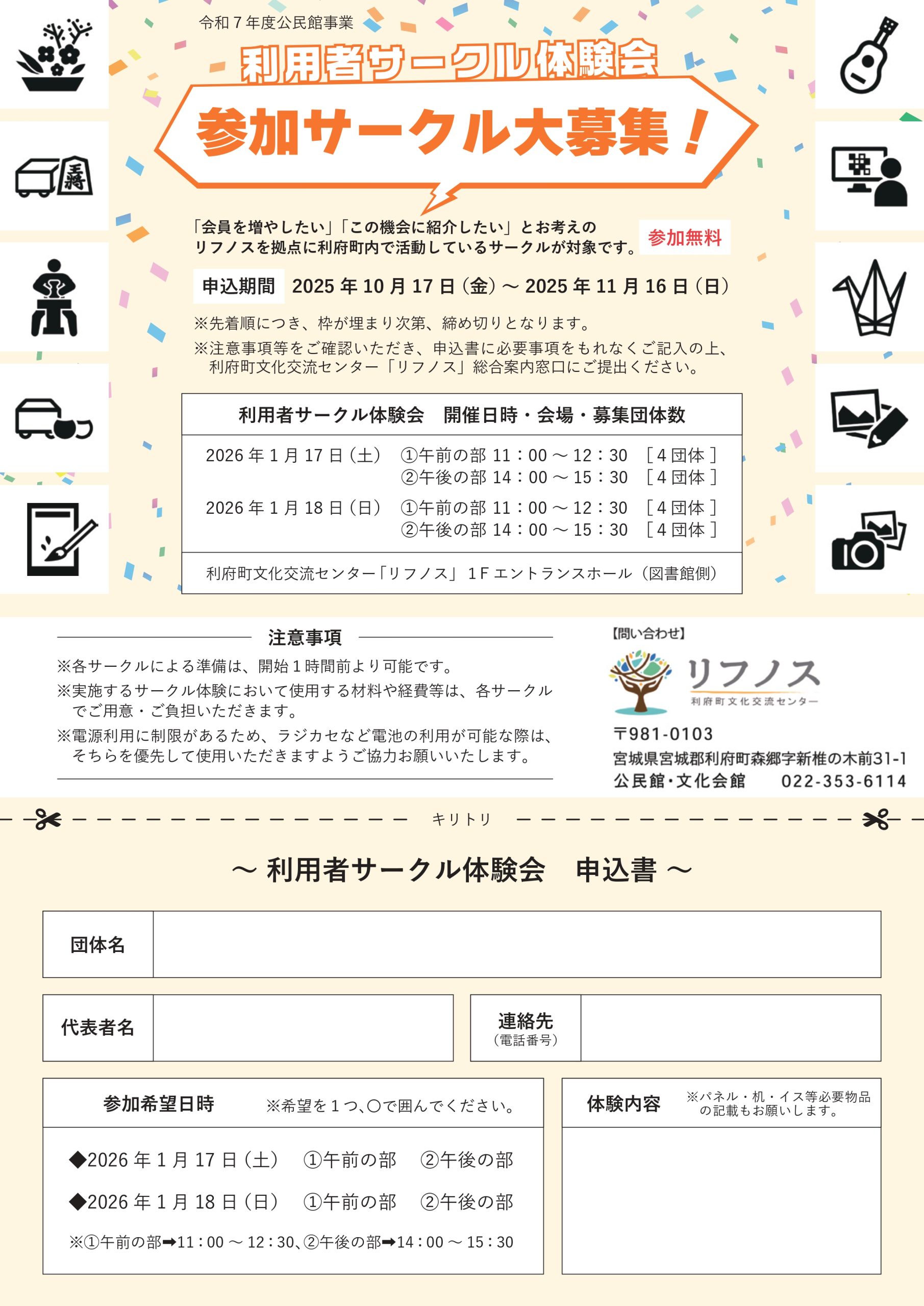 2025.10.01 公民館文化会館 令和7年度 利府町文化祭について【開催:11月2日(日)・3日(月)】 2025.10.01 公民館 【参加サークル募集】利用者サークル体験会【申込期間:10月17日(金)~11月16日(日)】 2025.09.30 カフェ公民館図書館文化会館 来館者100万人突破予想クイズを開催します!!(応募期間:10/1~10/11) 2025.08.31 公民館 【定員に達しました】10/15(水)開催 ベビーマッサージ教室【町内優先申込期間:9月15日(月)~9月28日(日)】 2025.08.30 公民館 10/20(月)開催 新幹線総合車両センター構内見学【申込期間:9月20日(土)~10月2日(木)】 2025.08.28 公民館 10/11(土)開催 おやこであそぼう【町内優先申込期間:9月11日(木)~9月25日(木)】 2025.08.07 公民館 9/21(日)開催 大人のものづくり教室【町内優先申込期間:8月21日(木)~9月4日(木)】 2025.08.07 公民館 【定員に達しました】9/20(土)開催 おやこでリフレッシュフラ教室【町内優先申込期間:8月20日(水)~9月3日(水)】 2025.07.30 公民館 【定員に達しました】9/13(土)開催 ベビーヨガ教室【町内優先申込期間:8月13日(水)~8月27日(水)】 2025.07.29 公民館 【定員に達しました】9/11(木)開催 利府町の食材で世界料理教室【町内優先申込期間:8月11日(月)~8月26日(火)】 123>>>