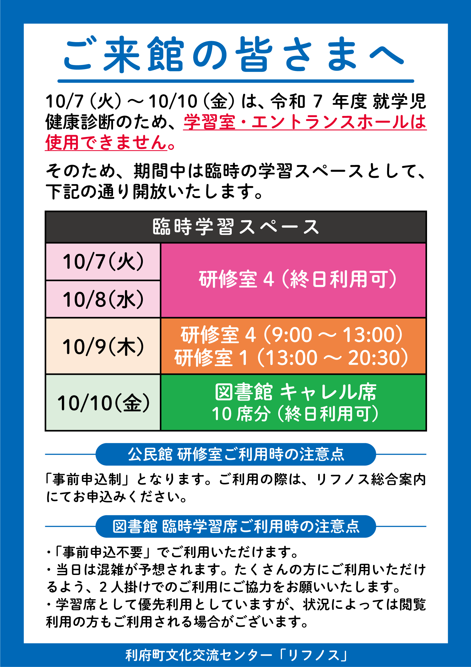 10/7(火)~10/10(金)の学習スペースの利用について