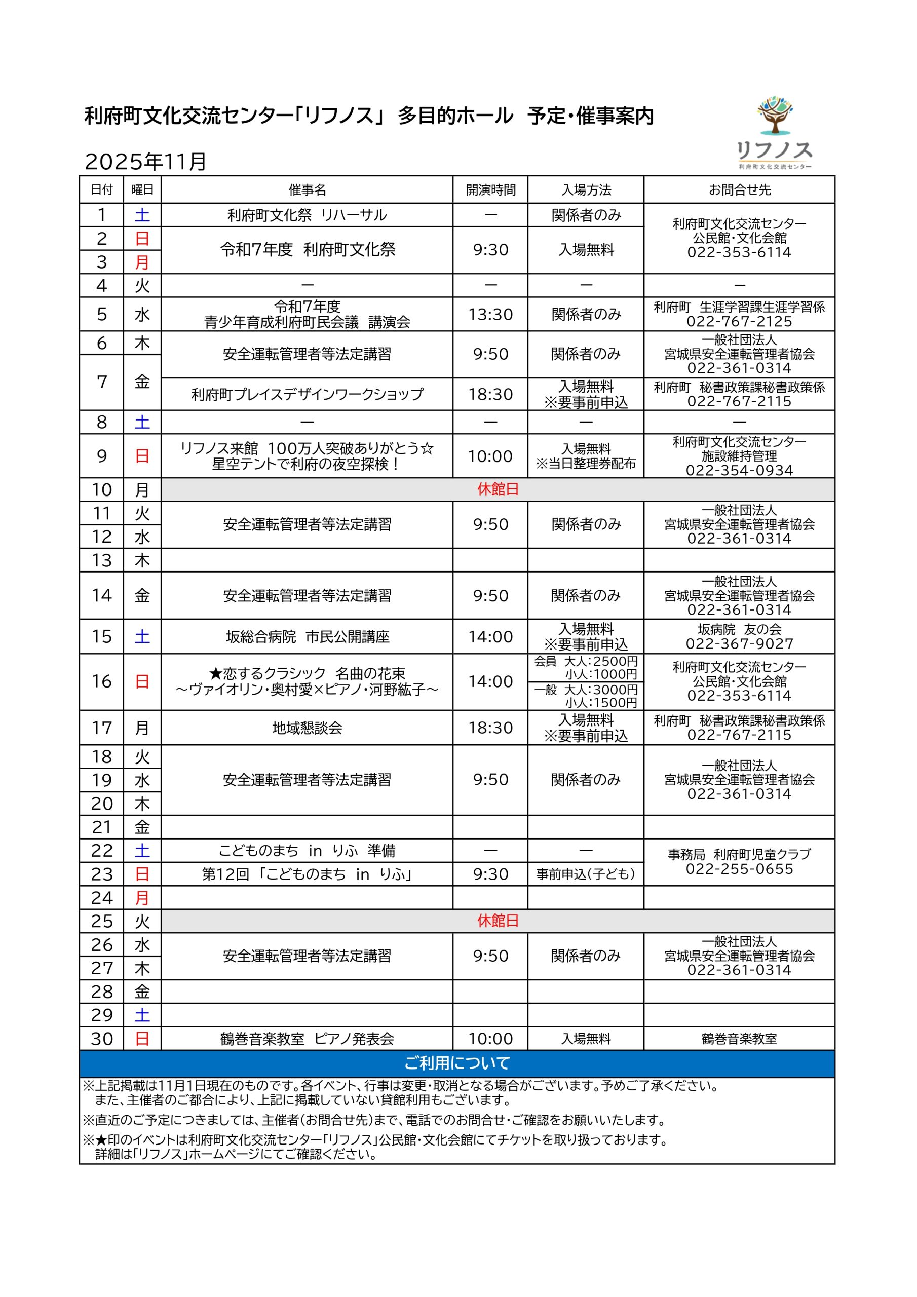 リフノス多目的ホール予定・催事案内(2025年11月) 文化会館 2025.11.01 2025年11月の利府町文化交流センター「リフノス」多目的ホールの予定・催事についてご案内いたします。 主催者都合により、内容の変更、中止や延期となる場合がございます。ご了承ください。 一覧に戻る