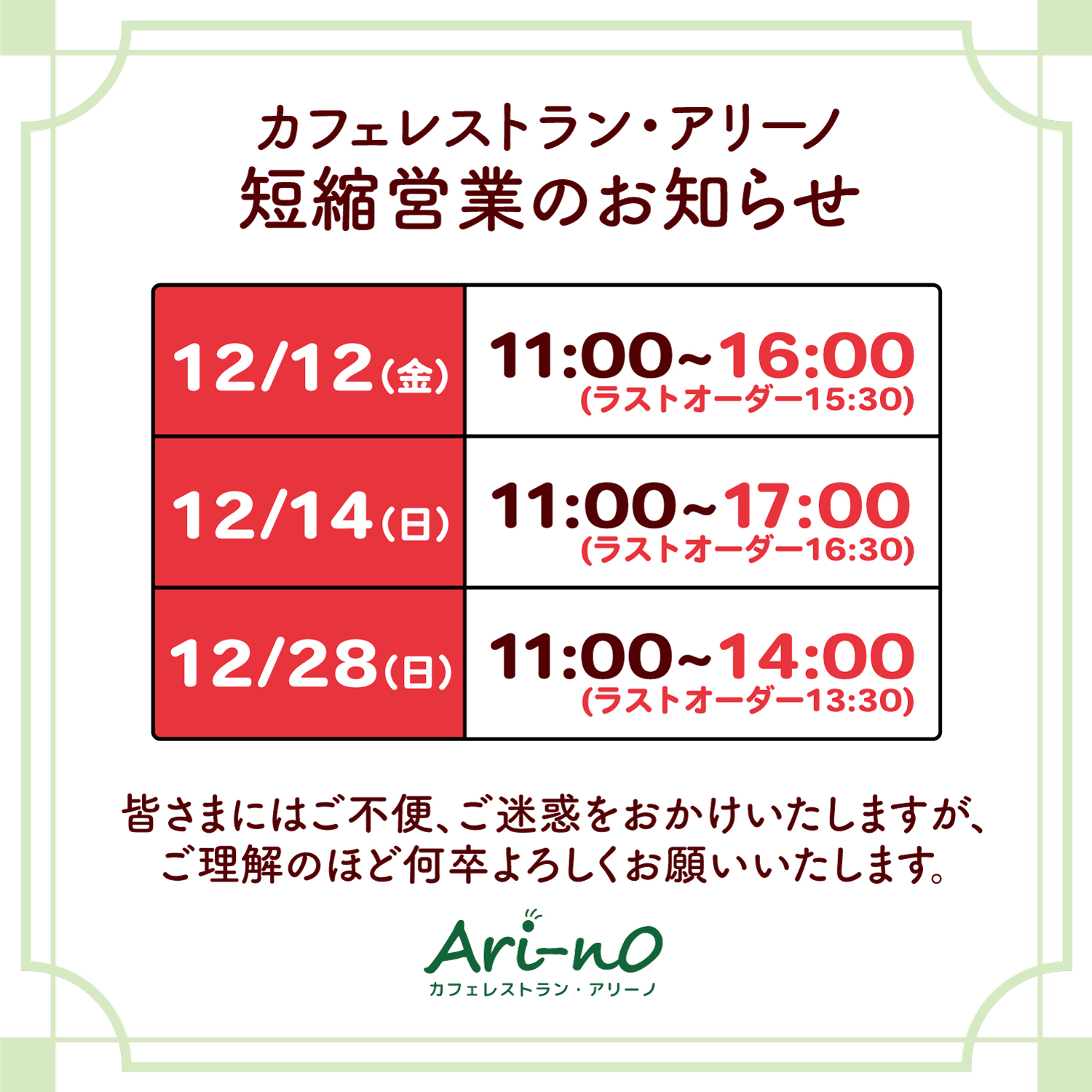 【カフェレストラン・アリーノ】短縮営業のお知らせ カフェ 2025.12.06 カフェレストラン・アリーノは下記日時を短縮営業とさせていただきます。 ◇12月12日(金) -営業時間- 11:00~16:00(ラストオーダー15:30) ◇12月14日(日) -営業時間- 11:00~17:00(ラストオーダー16:30) ◇12月28日(日) -営業時間- 11:00~14:00(ラストオーダー13:30) 皆さまにはご不便、ご迷惑をお掛けいたしますが、 ご理解のほど何卒よろしくお願いいたします。 一覧に戻る