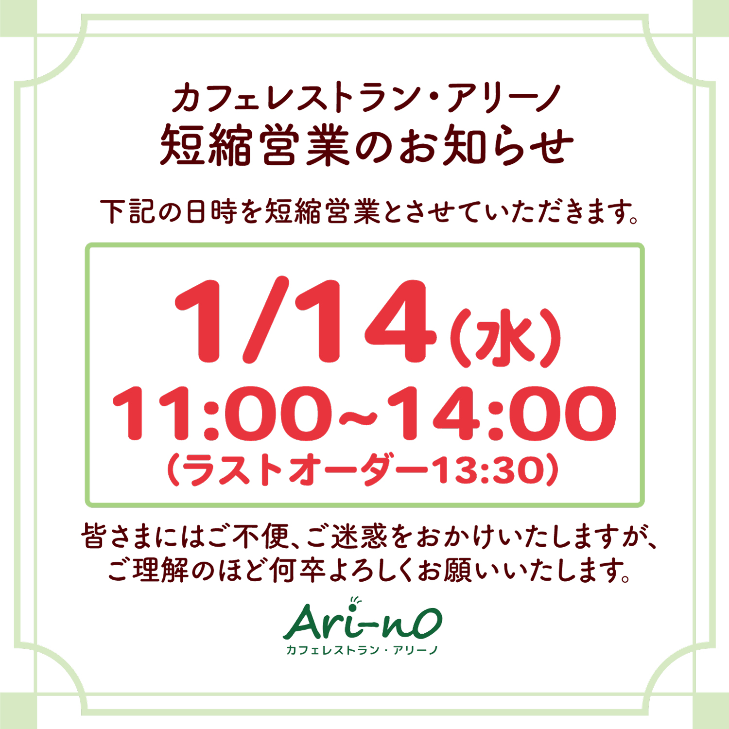 【カフェレストラン・アリーノ】1/14㈬短縮営業のお知らせ カフェ 2026.01.09 カフェレストラン・アリーノは下記日時を短縮営業とさせていただきます。 ◇1月14日(水) -営業時間- 11:00~14:00(ラストオーダー13:30) 皆さまにはご不便、ご迷惑をお掛けいたしますが、 ご理解のほど何卒よろしくお願いいたします。 一覧に戻る